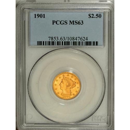 <B>1901 $2 1/2 MS63 PCGS.</B></I> Select and solidly struck with strong luster. This turn-of-the-century piece has considerable eye appeal, though a few light abrasions on the chin and neck and a handful of grazes in the fields inhibit the grade.<BR><I>From The James Paul Collection.</B></I><BR><BR><b>Shipping:</b> Coin/Currency (<a target="_blank" href="http://www.heritageauctions.com/common/shipping.php">view shipping information</a>)