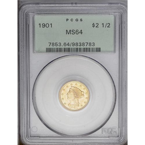 <B>1901<$2 1/2> MS64 PCGS.</B></I> This lustrous honey-gold near-Gem is housed in a prior generation holder. The strike is exacting, and no marks of relevance are found. The date is lightly repunched south.