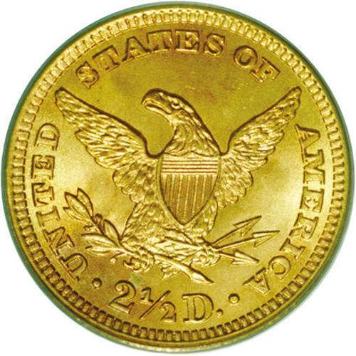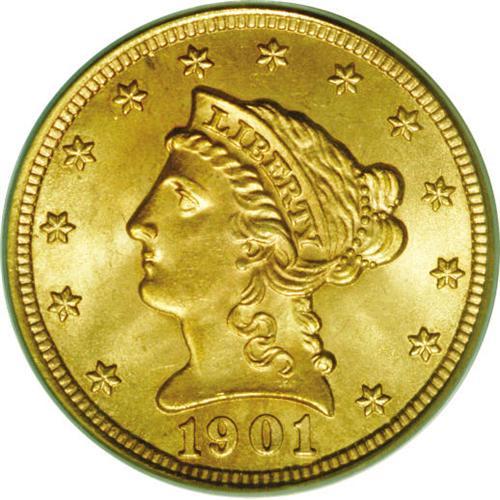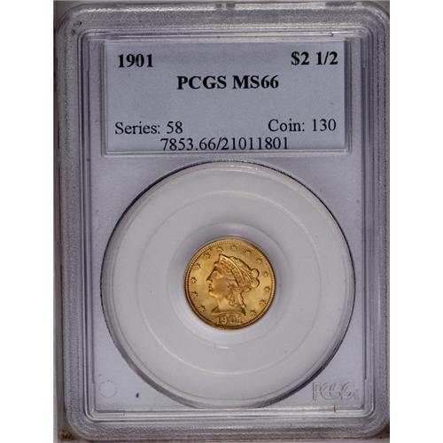 <B>1901<$2 1/2> MS66 PCGS.</B></I> The base of the second 1 in the date is lightly repunched. This needle-sharp and fully lustrous peach-gold Premium Gem is essentially immaculate. Population: 49 in 66, 7 finer (2/06).