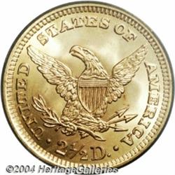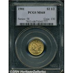 <B>1901<$2 1/2> MS68 PCGS.</B></I> Even after the production of Gold Dollars and Three Dollar Gold pieces ceased in 1889, the mintages of Quarter Eagles remained low. The higher denominations, Half Eagles through Double Eagles, were favored for bullion reserves and international trade. After bottoming out with a production of 2,440 pieces in 1892, however, Quarter Eagle mintages steadily rose thereafter until World War I interrupted overseas shipments.<BR><BR> For the 1901 issue, 91,100 pieces were struck. Mint State survivors are not rare, although they are encountered considerably less often than the high mintage final year of the type, 1907. The Quarter Eagle denomination is not as prone to bagmarks as the larger diameter gold coins, however, even the slightest marks will typically disqualify Uncirculated examples from the lofty Superb Gem level. This lovely representative possesses blushes of honey-gold color, and the strike and luster are exemplary. The fields are unmarked, and only the faintest grazes on the chin deny perfection. The base of the second 1 in the date is recut. As of (6/04), this is the single finest business strike 1901 Quarter Eagle certified by PCGS. <BR><BR><B>Important notice:</B> Heritage usually auctions material at the rate of 200-250 lots per hour. On some occasions eBay Live bid software or the Internet may not be able to keep up with the pace of the auction. We recommend placing a realistic absentee bid now as insurance to avoid disappointment. Occasionally the auctioneer may eliminate or reject an eBay Live bid, and the auctioneer may also reopen a lot after the close of the eBay live bidding (usually because we missed an audience bid), and may reject your bid even if it shows you as the winning bidder. By bidding via eBay Live, you agree that Heritage may award the lot to another bidder at its sole discretion under the circumstances described above or any other reasonable circumstances. Since eBay bids are not shown to us until we open the lot on the floor, we treat those bids just like floor bids. In most cases the floor responds before the eBay bid is presented to us, due to Internet lag time, so for consistency we have made it a policy that floor bids are always considered first over tie eBay live bids. Also please note that all Heritage lots purchased through eBay Live carry a 20% Buyer's Premium. Please make sure you read the Terms and Conditions before you bid. </span></font></tr></table></td></tr></table>