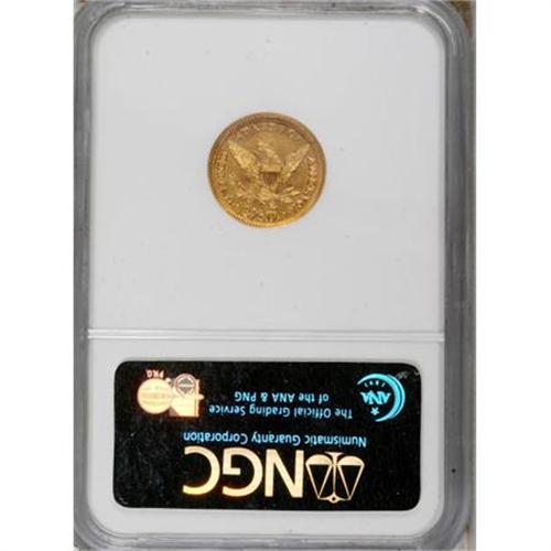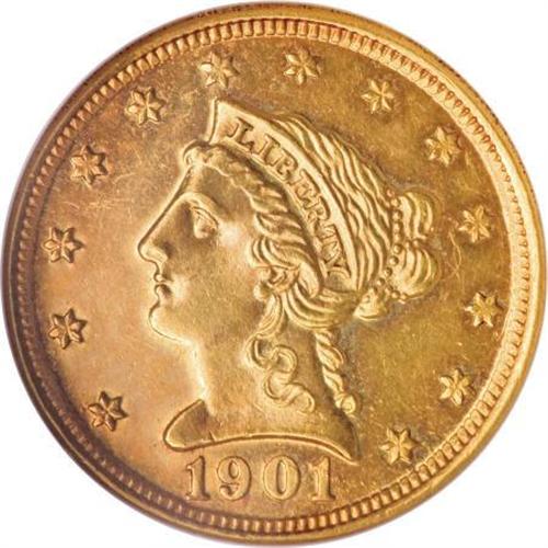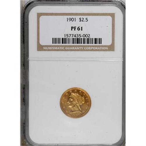 <B>1901 $2 1/2 PR61 NGC.</B></I> Only 223 proofs were struck of the 1901 quarter eagle, and yet this issue has the highest mintage of any proof Liberty Head two and a half. This date exists in a wide variety of grades from impaired through PR69. It is curious to note, however, that this is the first example we have offered at public auction in almost three years. The lightly hairlined surfaces show an overlay of reddish patina with a slight accent of lilac interspersed. A number grade-limiting contact marks are also seen on each side.<BR><BR><B>Coin Engraver:</B> Christian Gobrecht<BR><BR><b>Shipping:</b> Coins & Currency (<a target="_blank" href="http://www.heritageauctions.com/common/shipping.php">view shipping information</a>)