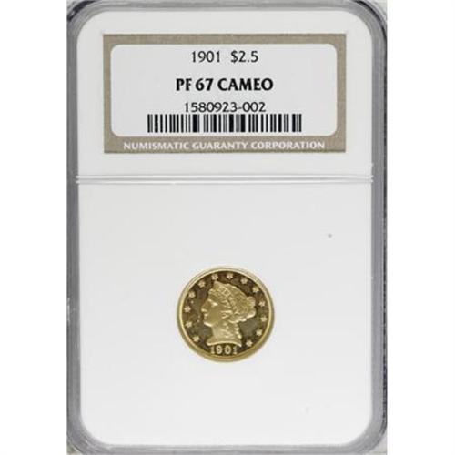 <B>1901 $2 1/2 PR67 Cameo NGC.</B></I> The 1901 has the highest mintage of any proof Liberty Head quarter eagle (223 pieces). The issue is relatively available, as can be seen from the population data; close to 100 examples have been certified by NGC and PCGS. Even Cameos can be located, as the two services have given about 60 coins this designation, the vast majority of which fall into the PR62 to PR65 Cameo range.<BR> The Superb Gem Cameo offered here exhibits delightful peach-gold surfaces that display sharply impressed design elements. Both faces are smooth and devoid of mentionable marks, and yield outstanding fields-motif contrast. Census: 3 in 67 Cameo, 2 finer (6/07).<BR><BR><b>Shipping:</b> Coins & Currency (<a target="_blank" href="http://www.heritageauctions.com/common/shipping.php">view shipping information</a>\)