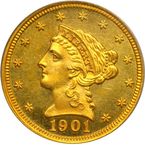 1901 $2.50 Liberty. PCGS graded MS-66. A marvelous gem quarter eagle loaded with pizzazz! Rich golden hues and captivating semi-reflective fields add to the eye appeal, solidifying this coin as an extremely desirable example. Looks like a proof. Pop 77; 6 finer, 5 in 67, 1 in 68 (PCGS # 7853) .