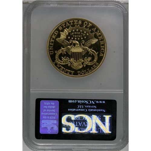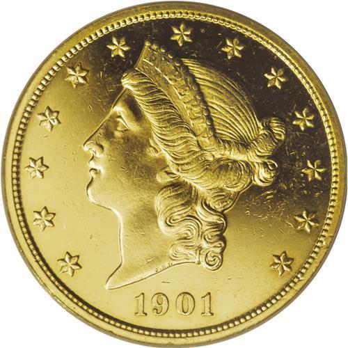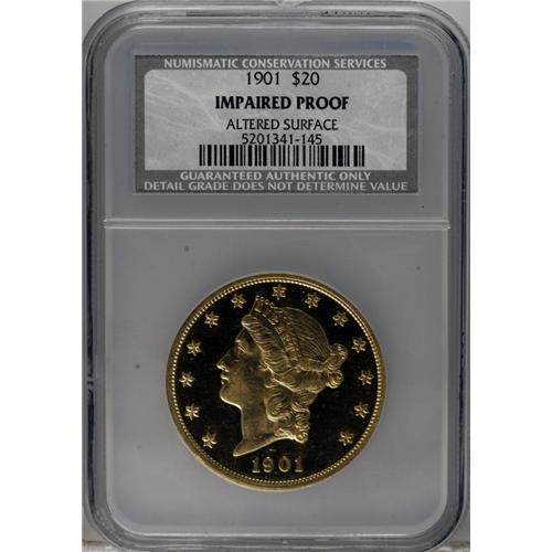 <B>1901 $20 --Altered Surface--NCS. Impaired Proof.</B></I> Only 96 proof double eagles were struck in 1901, and Breen (1988) estimates, "Possibly 36-40 proofs survive, many impaired." This lightly hairlined specimen has a few tiny obverse field marks, and the highpoints of the hair exhibit a whisper of friction. The devices are razor-sharp, and display obvious cameo contrast with the mirrored fields.<BR><BR><b>Shipping:</b> Coins & Currency (<a target="_blank" href="http://www.heritageauctions.com/common/shipping.php">view shipping information</a>)