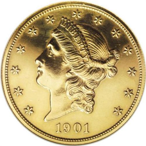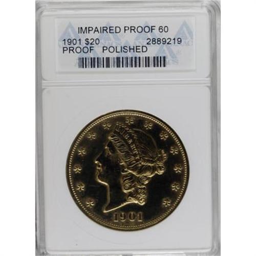 <B>1901 $20 --Polished--ANACS. Impaired Proof.</B></I> 96 proofs were struck, but in his 1988 <I>Encyclopedia,</B></I> Breen wrote "possibly 36 to 40 proofs survive, many impaired." Given their high face value, many proofs were undoubtedly spent and eventually turned in to the government after the 1933 gold recall. This well struck specimen is bright and faintly hairlined but is an affordable representative of these rare dies.<BR><BR><B>Coin Engraver:</B> James B. Longacre<BR><BR><b>Shipping:</b> Coins & Currency (<a target="_blank" href="http://www.heritageauctions.com/common/shipping.php">view shipping information</a>\)