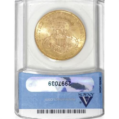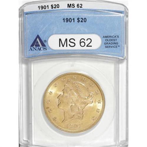 <B>1901 $20 MS62 ANACS.</B></I> NGC Census: (526/2315). PCGS Population (765/2829). Mintage: 111,400. Numismedia Wsl. Price for NGC/PCGS coin in MS62: $755. (#9039)<BR><BR><B>Coin Engraver:</B> James B. Longacre<BR><BR><b>Shipping:</b> Coins & Currency (<a target="_blank" href="http://www.heritageauctions.com/common/shipping.php">view shipping information</a>\)