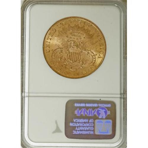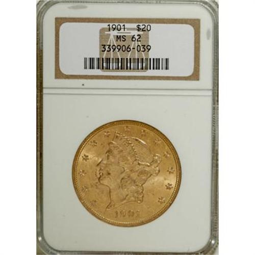 <B>1901 $20 MS62 NGC.</B></I> Crisply struck for this turn-of-the-century issue with pale golden centers and deeper sun-gold near the rims. A number of light to moderate marks appear on the devices.<BR><BR><B>Coin Engraver:</B> James B. Longacre<BR><BR><b>Shipping:</b> Coins & Currency (<a target="_blank" href="http://www.heritageauctions.com/common/shipping.php">view shipping information</a>)