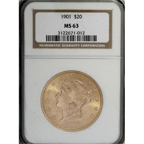 <B>1901 $20 MS63 NGC.</B></I> . NGC Census: (895/1491). PCGS Population (1386/1526). Mintage: 111,400. Numismedia Wsl. Price for NGC/PCGS coin in MS63: $1,350. (#9039)<BR><BR><B>Coin Engraver:</B> James B. Longacre<BR><BR><b>Shipping:</b> Coins & Currency (<a target="_blank" href="http://www.heritageauctions.com/common/shipping.php">view shipping information</a>)