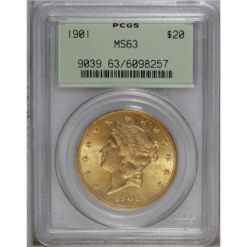 <B>1901<$20> MS63 PCGS.</B></I> This crisply struck lemon-tinted example has full luster and refreshingly smooth surfaces for the MS63 level. A popular lower mintage date. Housed in an old green label holder.