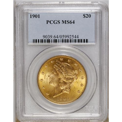 <B>1901 $20 MS64 PCGS.</B></I> An attractive near-Gem with super luster and pleasing apricot-gold color, all of which are complemented by a sharp strike. A few minor marks leap from full gem status.<BR><BR><b>Shipping:</b> Coin/Currency (<a target="_blank" href="http://www.heritageauctions.com/common/shipping.php">view shipping information</a>)