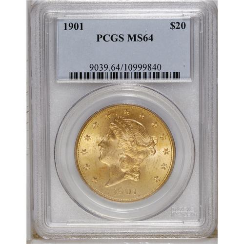 <B>1901 $20 MS64 PCGS.</B></I> Apricot-gold and peach-gold combine on the surfaces of this near-Gem; the former dominates the obverse, while the latter is prominent on the reverse. Crisply struck with a few too many scattered marks to reach a higher grade.<BR><BR><b>Shipping:</b> Coin/Currency (<a target="_blank" href="http://www.heritageauctions.com/common/shipping.php">view shipping information</a>)