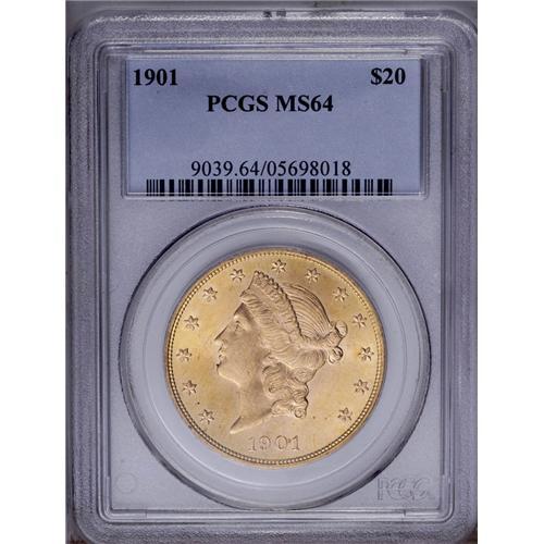<B>1901<$20> MS64 PCGS.</B></I> Breen-7337. The first 1 in the date is nicely repunched south. This well struck honey-gold double eagle features a splendidly smooth reverse. The obverse field is also clean, and only moderate grazes on the cheek limit the grade.