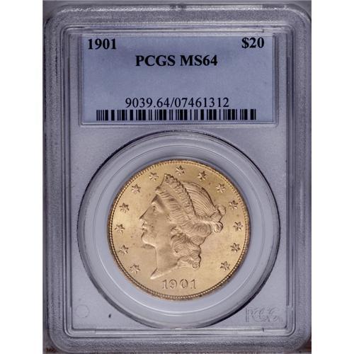 <B>1901<$20> MS64 PCGS.</B></I> Fully struck with dazzling color and luster, qualities that have proven to be typical on this well produced P-mint twenty. Only an ill-placed milling mark on Liberty's cheek keeps this example from Gem status.