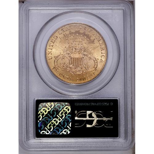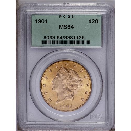 <B>1901<$20> MS64 PCGS.</B></I> One of the more common dates in this grade, second only to the very common 1904. Nevertheless, this piece has above average eye appeal due to a light tinge of orange toning. Both sides display satiny luster, a lovely cartwheel effect, and nice surfaces. <BR><BR><B>Important notice:</B> Heritage usually auctions material at the rate of 200-250 lots per hour. On some occasions eBay Live bid software or the Internet may not be able to keep up with the pace of the auction. We recommend placing a realistic absentee bid now as insurance to avoid disappointment. Occasionally the auctioneer may eliminate or reject an eBay Live bid, and the auctioneer may also reopen a lot after the close of the eBay live bidding (usually because we missed an audience bid), and may reject your bid even if it shows you as the winning bidder. By bidding via eBay Live, you agree that Heritage may award the lot to another bidder at its sole discretion under the circumstances described above or any other reasonable circumstances. Since eBay bids are not shown to us until we open the lot on the floor, we treat those bids just like floor bids. In most cases the floor responds before the eBay bid is presented to us, due to Internet lag time, so for consistency we have made it a policy that floor bids are always considered first over tie eBay live bids. Also please note that all Heritage lots purchased through eBay Live carry a 20% Buyer's Premium. Please make sure you read the Terms and Conditions before you bid. This lot is being auctioned in conjunction with a live floor auction by Heritage Galleries & Auctioneers. All final auction and invoice information will be supplied by Heritage Galleries & Auctioneers, and all other information should be considered preliminary. Lot:4405 <BR><BR><B>Winning Notification and Billing:</B> After the FINAL session in this auction is complete, Heritage will send e-mail and snail mail invoices. This process normally takes several days. All final auction and invoice information will be supplied by Heritage Galleries & Auctioneers, and all other information should be considered preliminary. <BR><BR>This auction will be conducted on a live auction floor and over the Internet through eBay Live. If you choose to place an absentee bid, please take a moment to <font color='#0000ff'><u><a href='http://pages.ebay.com/liveauctions/help/before/laabsentee.html'>learn how eBay Live absentee bidding works</a></u></font><font color='#000000'>