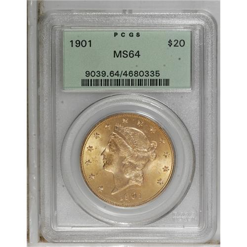 <B>1901 $20 MS64 PCGS.</B></I> The shimmering peach-gold surfaces have glints of orange and canary-yellow. Carefully preserved overall with a single grade-defining abrasion at the truncation of the bust. A delightful example of this turn-of-the-century issue.<BR><BR><b>Shipping:</b> Coins & Currency (<a target="_blank" href="http://www.heritageauctions.com/common/shipping.php">view shipping information</a>)