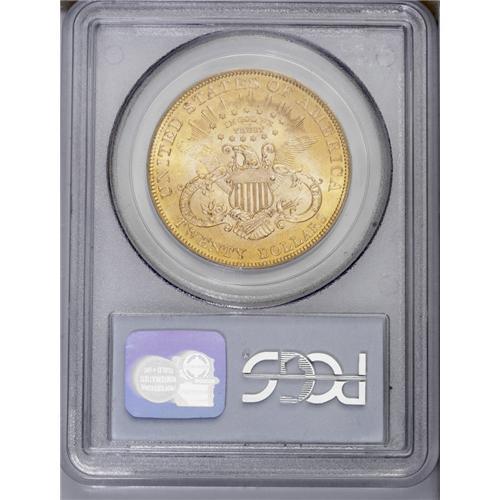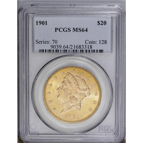 <B>1901<$20> MS64 PCGS.</B></I> This attractive near-Gem displays excellent luster and attractive hues of peach, yellow, and apricot-gold patina. The design elements are sharply impressed, and just a few minute marks are seen on each side. Nice eye appeal for the grade. <BR><BR><B>Important notice:</B> Heritage usually auctions material at the rate of 200-250 lots per hour. On some occasions eBay Live bid software or the Internet may not be able to keep up with the pace of the auction. We recommend placing a realistic absentee bid now as insurance to avoid disappointment. Occasionally the auctioneer may eliminate or reject an eBay Live bid, and the auctioneer may also reopen a lot after the close of the eBay live bidding (usually because we missed an audience bid), and may reject your bid even if it shows you as the winning bidder. By bidding via eBay Live, you agree that Heritage may award the lot to another bidder at its sole discretion under the circumstances described above or any other reasonable circumstances. Since eBay bids are not shown to us until we open the lot on the floor, we treat those bids just like floor bids. In most cases the floor responds before the eBay bid is presented to us, due to Internet lag time, so for consistency we have made it a policy that floor bids are always considered first over tie eBay live bids. Also please note that all Heritage lots purchased through eBay Live carry a 20% Buyer's Premium. Please make sure you read the Terms and Conditions before you bid. This lot is being auctioned in conjunction with a live floor auction by Heritage Galleries & Auctioneers. All final auction and invoice information will be supplied by Heritage Galleries & Auctioneers, and all other information should be considered preliminary. Lot:4406 <BR><BR><B>Winning Notification and Billing:</B> After the FINAL session in this auction is complete, Heritage will send e-mail and snail mail invoices. This process normally takes several days. All final auction and invoice information will be supplied by Heritage Galleries & Auctioneers, and all other information should be considered preliminary. <BR><BR>This auction will be conducted on a live auction floor and over the Internet through eBay Live. If you choose to place an absentee bid, please take a moment to <font color='#0000ff'><u><a href='http://pages.ebay.com/liveauctions/help/before/laabsentee.html'>learn how eBay Live absentee bidding works</a></u></font><font color='#000000'>