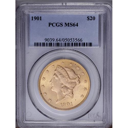 <B>1901<$20> MS64 PCGS.</B></I> This peach-tinged Choice double eagle possesses clean fields, and the cheek is only moderately abraded. A commanding strike and dazzling luster confirm the appeal.