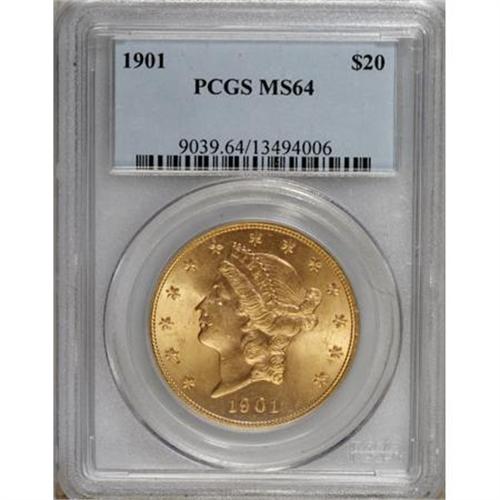 <B>1901 $20 MS64 PCGS.</B></I> A softly lustrous orange-gold example of this turn-of-the-century issue, boldly impressed with excellent visual appeal. A touch of cloudiness visits the minimally marked obverse surfaces.<BR><BR><B>Coin Engraver:</B> James B. Longacre<BR><BR><b>Shipping:</b> Coins & Currency (<a target="_blank" href="http://www.heritageauctions.com/common/shipping.php">view shipping information</a>)