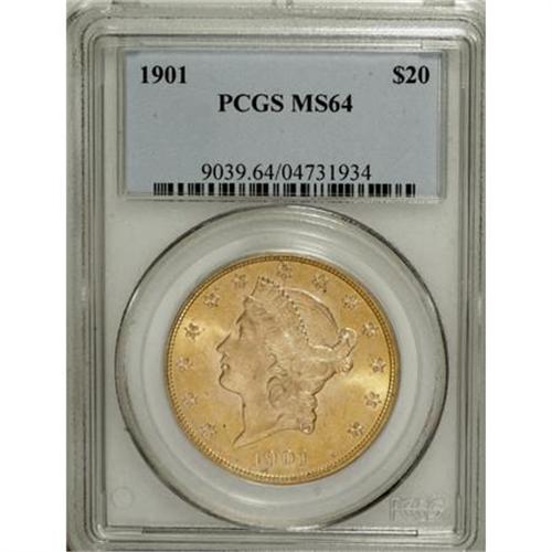 <B>1901 $20 MS64 PCGS.</B></I> Radiant luster and exquisitely struck motifs highlight this attractive near-Gem twenty. Some minute luster grazes on bright yellow-gold surfaces preclude full Gem status.<BR><BR><B>Coin Engraver:</B> James B. Longacre<BR><BR><b>Shipping:</b> Coins & Currency (<a target="_blank" href="http://www.heritageauctions.com/common/shipping.php">view shipping information</a>)