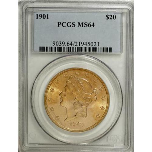 <B>1901 $20 MS64 PCGS.</B></I> The upper obverse and the reverse of this near-Gem are vibrant orange-gold, while paler straw-gold graces the area of Liberty's neck and the date. Well-defined with a dot of alloy to the left of the lowest curl.<BR><BR><B>Coin Engraver:</B> James B. Longacre<BR><BR><b>Shipping:</b> Coins & Currency (<a target="_blank" href="http://www.heritageauctions.com/common/shipping.php">view shipping information</a>)