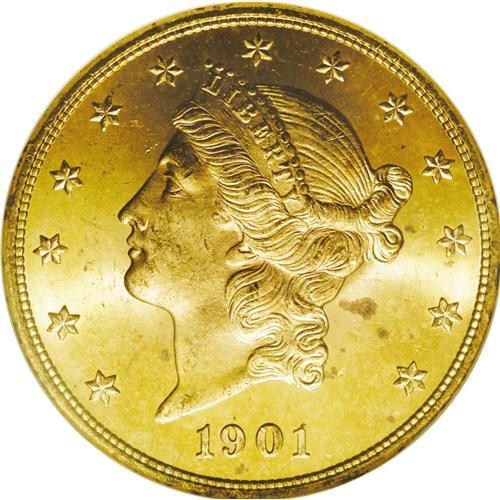 <B>1901<$20> MS65 NGC.</B></I> A boldly struck Gem that has blazing cartwheel luster and impressively undisturbed surfaces. A number of coffee-colored alloy spots are seen scattered over each side, these being caused by an improper alloy mix in the planchet. Only 111,430 pieces were struck, which is only a fraction of the majority of the 20th Century issues in the series.