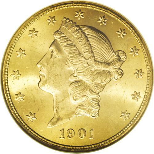 <B>1901<$20> MS65 NGC.</B></I> Considerable numbers of this issue exist in grades up to Gem condition. Their availability is apparently the result of bags being sent to Europe, a phenomenon more often seen with certain Saint-Gaudens double eagle issues. The present piece boasts rich, mellow orange-gold surfaces with ebullient cartwheel luster and lacking all but the most trivial abrasions. This phenomenally nice coin approaches the pinnacle of the certified population: NGC has certified none finer, while PCGS has assigned an MS66 grade to three pieces (6/06).