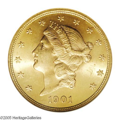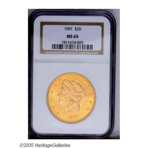 <B>1901<$20> MS65 NGC.</B></I> Booming luster and bright peach color provides imposing eye appeal. A well struck Gem that has clean surfaces with no offensive marks. The 1901 has a fairly low mintage of 111,430 pieces. Although Mint State examples are always available, NGC has yet to certify any pieces above the MS65 level.<BR><I>From The Meads Point Collection.</B></I>