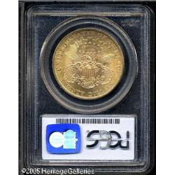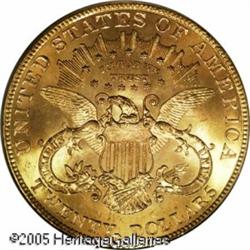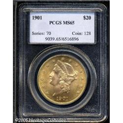 <B>1901 $20 MS65 PCGS.</B></I> A difficult date to find in full Gem condition, and this one boasts full blazing luster, rich orange-gold color and the usual sharp strike. Although rather common in most grades, the known examples which retain the desirable Gem surfaces is fairly low, and virtually impossible to locate finer save for three examples graded higher between the two grading services. Population: 221 in 65, 3 finer (1/05). Lot:9302
