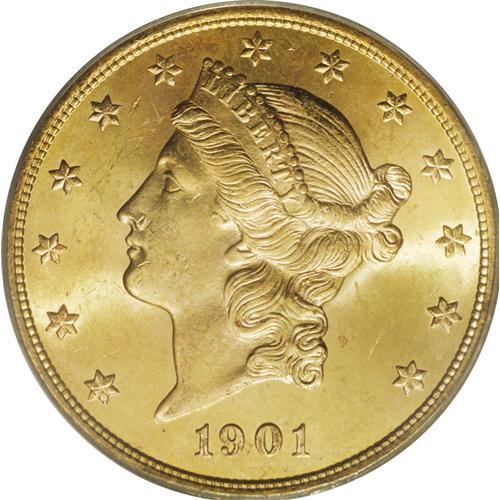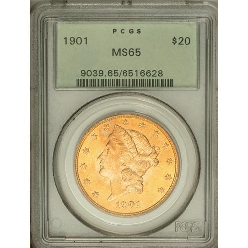 <B>1901 $20 MS65 PCGS.</B></I> Garrett and Guth (2006) report that a large hoard of high quality examples of this date emerged during the 1990s, making the 1901 a popular issue for type purposes. This example is fully struck and displays intense, vibrant luster. The variegated toning scheme is highly attractive. A few scattered marks are noted, but the overall quality of the piece pronounces it a Gem. Encapsulated in a green label holder.<BR><I>From The Kutasi Collection.</B></I><BR><BR><b>Shipping:</b> Coin/Currency (<a target="_blank" href="http://www.heritageauctions.com/common/shipping.php">view shipping information</a>)