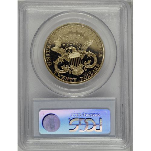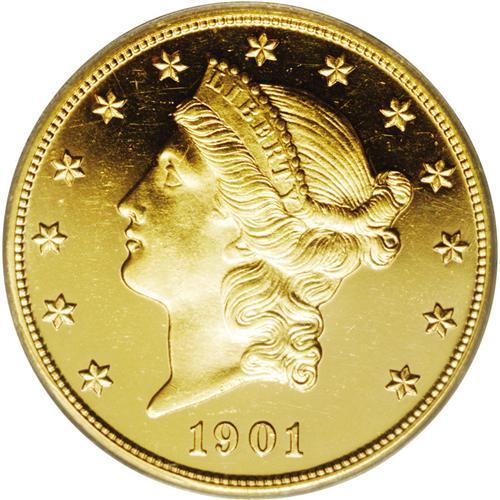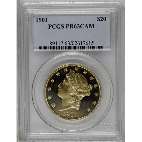 <B>1901<$20> PR63 Cameo PCGS.</B></I> Only 96 proof double eagles were struck in 1901, and of that number, attrition has taken a rather high toll over the decades. Today, it is estimated that only 35-40 pieces still remain in all grades, and a fair number of those are impaired in some way. This is an attractive specimen that shows illimitable depth of mirrored reflectivity in the fields, and also displays a surprising amount of frost on the devices, yielding a moderate two-toned cameo effect. A few small contact marks limit the grade but do little to inhibit the overall visual appeal of this important proof. For pedigree purposes, a small group of marks is noted over OLL of DOLLARS in the lower reverse field. Population: 2 in 63 Cameo, 11 finer (2/06).