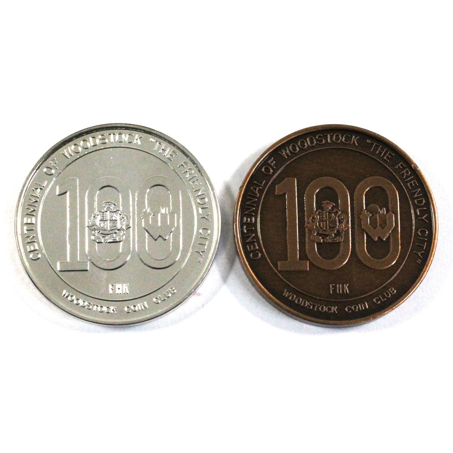 1901-2001 Centennial of Woodstock "The Friendly City" Medallions of the Same Design, One is 1oz of .999 Fine Silver and One is Bronze. Woodstock coin club. Both medals 38mm diameter. 2pcs (TAX Exempt)