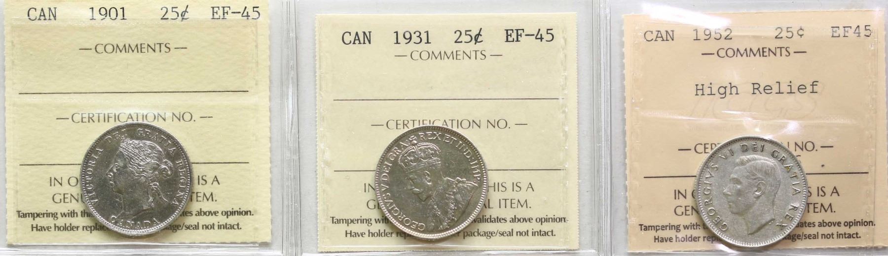 1901 25¢,1931, 1952 "High Relief", All 3 coins ICCS Choice Extra Fine-45.