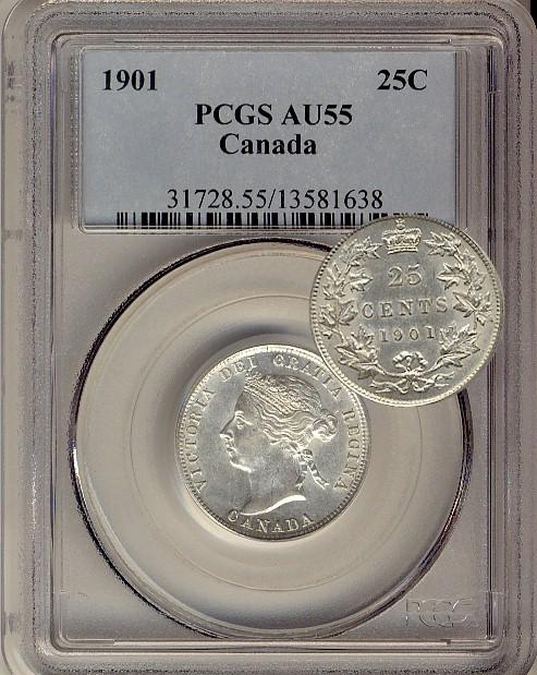 1901 25¢ PCGS AU55. PQ example with superb lustre.