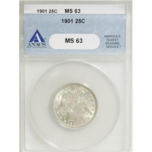 <B>1901 25C MS63 ANACS.</B></I> . NGC Census: (32/74). PCGS Population (44/65). Mintage: 8,892,813. Numismedia Wsl. Price for NGC/PCGS coin in MS63: $260. (#5628)<BR><BR><B>Coin Engraver:</B> Charles E. Barber<BR><BR><b>Shipping:</b> Coins & Currency (<a target="_blank" href="http://www.heritageauctions.com/common/shipping.php">view shipping information</a>)