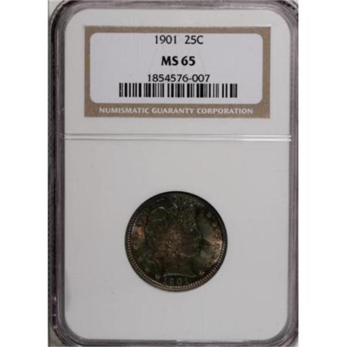 <B>1901 25C MS65 NGC.</B></I> Rich blue-green, gold, and rose patina drapes each side of this vibrantly lustrous Gem. Potent eye appeal and wonderful preservation for this turn-of-the-century issue. Census: 17 in 65, 4 finer (1/08).<BR><BR><B>Coin Engraver:</B> Charles E. Barber<BR><BR><b>Shipping:</b> Coins & Currency (<a target="_blank" href="http://www.heritageauctions.com/common/shipping.php">view shipping information</a>)