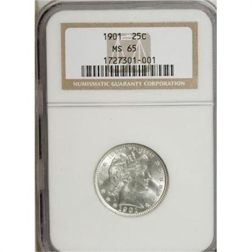 <B>1901 25C MS65 NGC.</B></I> Boldly struck with radiantly lustrous, brilliant-white surfaces. A high grade example of this underappreciated silver type. Census: 17 in 65, 4 finer (1/08).<BR><I>Ex: FUN Signature (Heritage, 1/04), lot 6082; Central States Signature (Heritage, 5/04), lot 6930.</B></I><BR><I>From The Southwest Collection.</B></I><BR><BR><B>Coin Engraver:</B> Charles E. Barber<BR><BR><b>Shipping:</b> Coins & Currency (<a target="_blank" href="http://www.heritageauctions.com/common/shipping.php">view shipping information</a>)