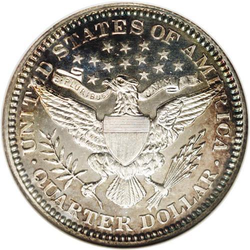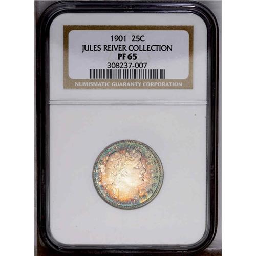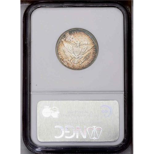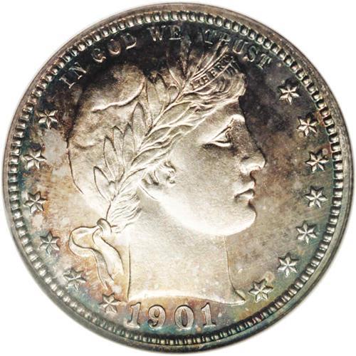 <B>1901<25C> PR65 NGC.</B></I> Only 813 proofs were struck of this popular date. This bright specimen displays a cameo-like effect and beautiful turquoise, lavender, and gold-brown toning. The design elements are sharply struck, with only the upper right (facing) corner of the shield and the eagle's left claw revealing minor weakness. The surfaces are of high quality throughout, and exhibit no significant marks.