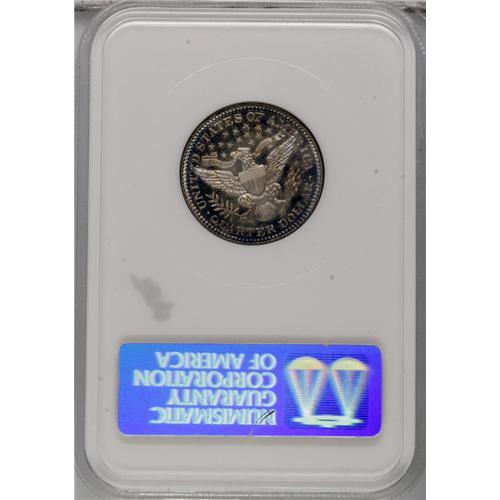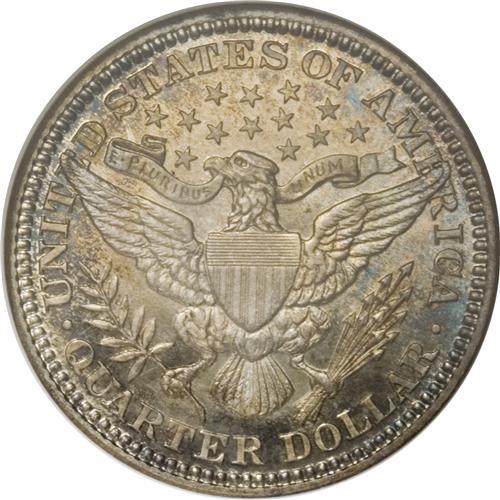 <B>1901 25C PR66 NGC.</B></I> Like the preceding proof, this piece also displays slight contrast between the fields and devices. Only 813 proofs were produced, which is a tiny percentage of the 8.89 million business strikes of this date. The fields are deeply reflective and shine forcefully through the light, multicolored toning seen over each side. A hairline-free example.<BR><BR><b>Shipping:</b> Coins & Currency (<a target="_blank" href="http://www.heritageauctions.com/common/shipping.php">view shipping information</a>)