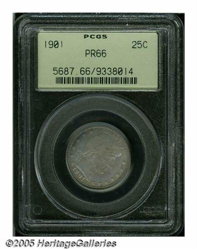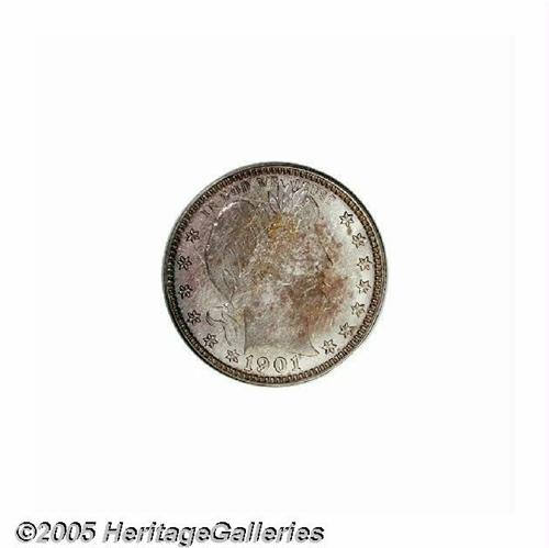 <B>1901<25C> PR66 PCGS.</B></I> Vivid silver-blue and rose-lilac patina. A well struck and exquisitely preserved Gem that has exceptional eye appeal due to the original multi-colored toning that blankets each side. Population: 18 in 66, 10 finer (6/05).