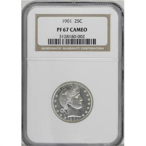 <B>1901 25C PR67 Cameo NGC.</B></I> The 1901 quarter comes with a proof mintage of 813 pieces, of which a fairly large number have survived to the present day. As expected, fewer Cameos are extant, especially in the higher grade levels. Exquisitely struck, with well preserved surfaces that exhibit just a trace of milky-gray reverse color. Census: 12 in 67 Cameo, 4 finer (1/08).<BR><BR><b>Shipping:</b> Coins & Currency (<a target="_blank" href="http://www.heritageauctions.com/common/shipping.php">view shipping information</a>)