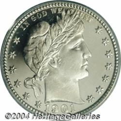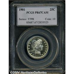 <B>1901<25C> PR67 Cameo PCGS.</B></I> The bright, watery fields are wonderfully contrasted against the well frosted devices. Untoned overall and surely one of the finest preserved examples known to collectors. True cameo examples are very difficult in this usually non-contrasting year consisting of a small mintage of only 813 proofs. Population: 3 in 67, none finer at either service (3/04).<BR><I>Ex: Baltimore Signature Sale (Heritage, 7/03), lot 7035, which realized $7,130.</B></I><BR><I>From the JFS Collection.</B></I> <BR><BR><B>Important notice:</B> Heritage usually auctions material at the rate of 200-250 lots per hour. On some occasions eBay Live bid software or the Internet may not be able to keep up with the pace of the auction. We recommend placing a realistic absentee bid now as insurance to avoid disappointment. Occasionally the auctioneer may eliminate or reject an eBay Live bid, and the auctioneer may also reopen a lot after the close of the eBay live bidding (usually because we missed an audience bid), and may reject your bid even if it shows you as the winning bidder. By bidding via eBay Live, you agree that Heritage may award the lot to another bidder at its sole discretion under the circumstances described above or any other reasonable circumstances. Since eBay bids are not shown to us until we open the lot on the floor, we treat those bids just like floor bids. In most cases the floor responds before the eBay bid is presented to us, due to Internet lag time, so for consistency we have made it a policy that floor bids are always considered first over tie eBay live bids. Also please note that all Heritage lots purchased through eBay Live carry a 20% Buyer's Premium. Please make sure you read the Terms and Conditions before you bid. </span></font></tr></table></td></tr></table>