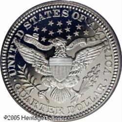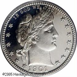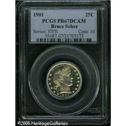 <B>1901 25C PR67 Deep Cameo PCGS.</B></I> Intensely reflective with billowy mint frost over the major design elements. Both sides exhibit the slightest golden tinge at the margins. 1901 Quarters just aren't supposed to display this level of contrast. Not only is this the only PR67 Deep Cameo certified by either major service, it is also the only Deep Cameo of any grade (01/05).<BR><I>From the Bruce Scher #1 All-Time PCGS Registry Set.</B></I> Lot:4093