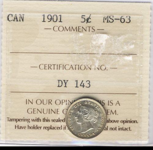 1901 5¢. A great mintstate example certified ICCS MS63. White example with full lustre.