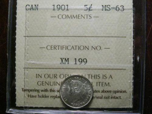 1901 5¢. A great mintstate example certified ICCS MS63. White example with full lustre.