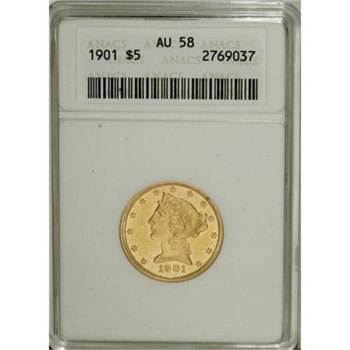 <B>1901 $5 AU58 ANACS.</B></I> NGC Census: (216/3407). PCGS Population (236/2010). Mintage: 615,900. Numismedia Wsl. Price for NGC/PCGS coin in AU58: $232. (#8402)<BR><BR><B>Coin Engraver:</B> Christian Gobrecht<BR><BR><b>Shipping:</b> Coins & Currency (<a target="_blank" href="http://www.heritageauctions.com/common/shipping.php">view shipping information</a>)