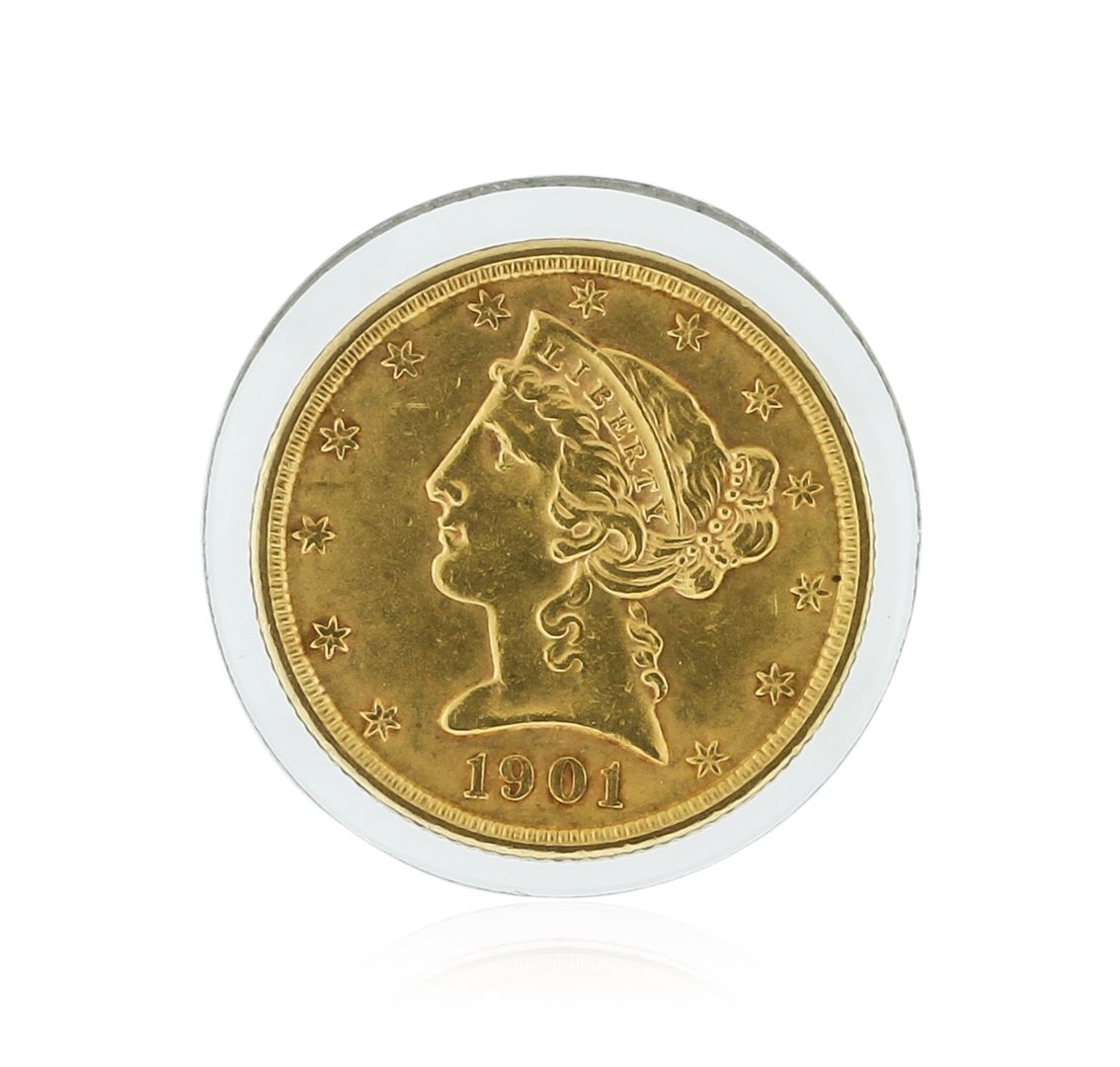 One 1901 $5 CU Liberty Head Half Eagle Gold Coin.