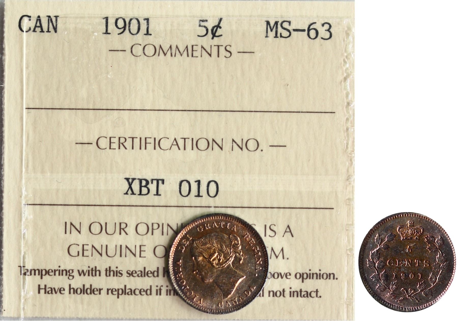 1901 5¢ ICCS Choice Mint State-63, Fully brilliant and lustrous.
