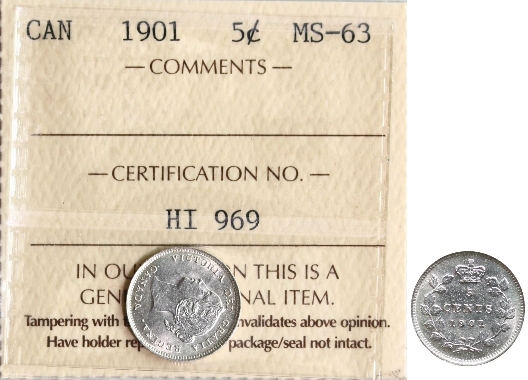 1901 5¢ ICCS Choice Mint State-63 Nice gold and russet tones over full underlying lustre.