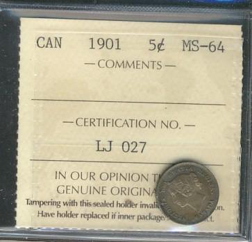 1901 5¢ ICCS MS64 attractive rainbow tone