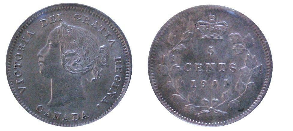1901 5¢ ICCS MS65. White with frostlike finish. Excellent strike with clean fields and great surfaces. Only 3 examples finer.